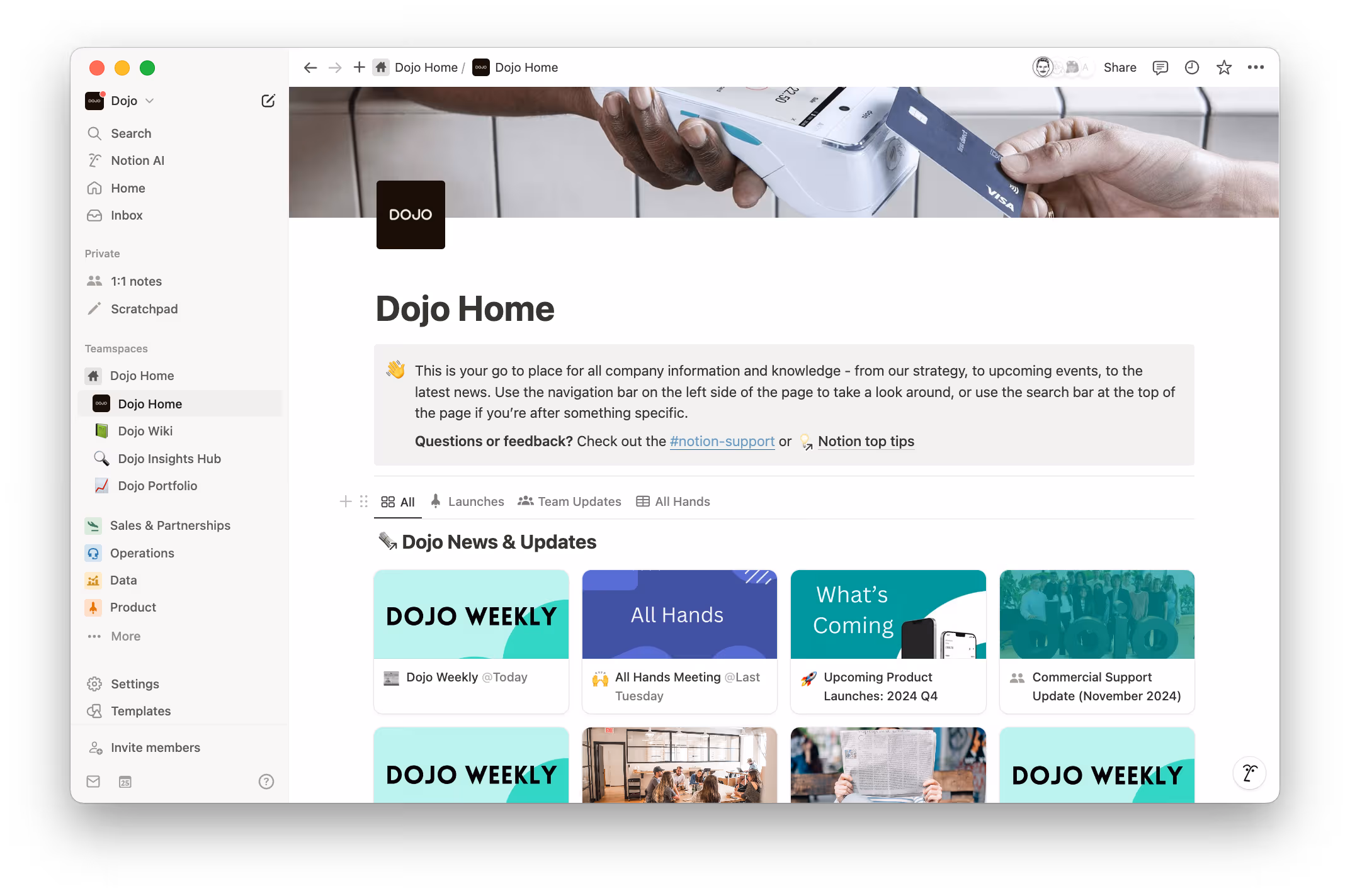 By first establishing Notion as the trusted destination for essential company knowledge and information, Dojo set the stage for it to naturally evolve into a central workspace where all teams could collaborate and manage their workflows together.